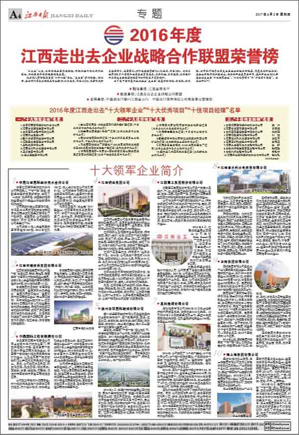 6月3日,江西走出去企業(yè)戰(zhàn)略合作聯(lián)盟2017年大會在南昌召開。省委常委、常務副省長毛偉明出席大會并作重要講話,會上省委常委、常務副省長毛偉明、省政府秘書長王亞聯(lián)和省商務廳廳長王水平分別為2016年度全省走出去“十大領軍企業(yè)”、“十大優(yōu)秀項目”和“十佳項目經(jīng)理”授牌。江西走出去企業(yè)戰(zhàn)略合作聯(lián)盟輪值主席、中國江西國際經(jīng)濟技術(shù)合作公司總經(jīng)理徐國建報告了2016年工作,國家開發(fā)銀行江西分行、中國進出口銀行江西省分行和中國出口信用保險公司南昌營管部作為聯(lián)盟副主席單位發(fā)言。公司董事長王元旦作為十大優(yōu)秀項目的企業(yè)代表發(fā)言?!督魅請蟆?、《江西衛(wèi)視》相繼對大會進行了大幅報道。